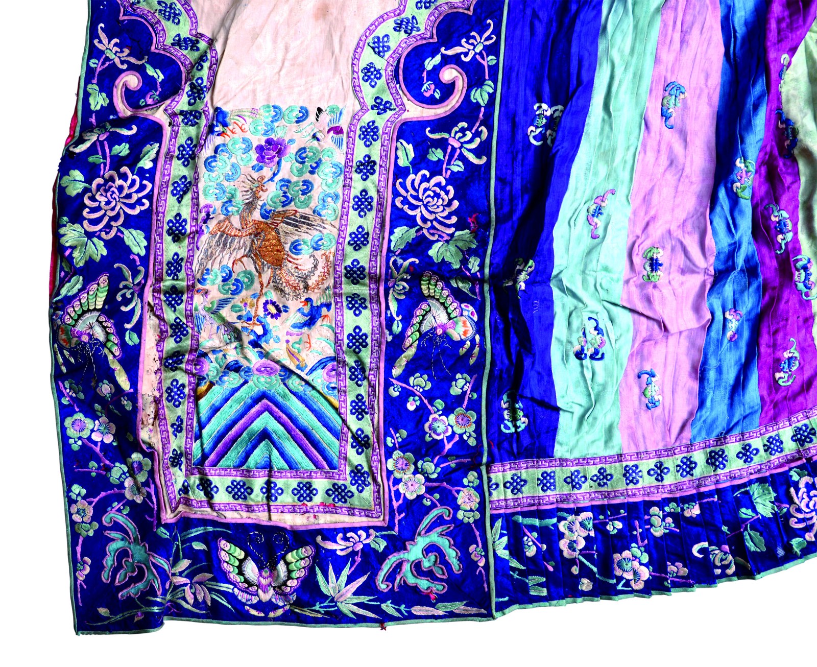 絲綢布襯底,采用廣繡針法,繡龍鳳花卉圖案。圍裙為清代民間女子服飾,是穿套在褲筒外用于裝飾的襯服。